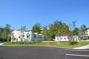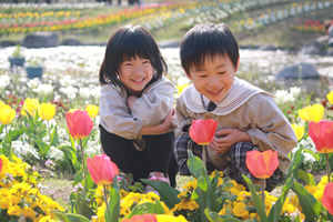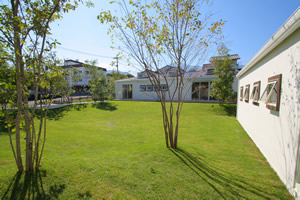 緑に囲まれる園庭に20本以上の樹木を植えこみ、春には花が咲き、夏には木影があり、冬には冷たい風にさらされない場所があり、できるだけ自然のままで草の多い丘があり、平地があり、窪地があり、段々があって園児が転んだり、走ったり、自由に遊ぶことの出来る広々とした園庭です。