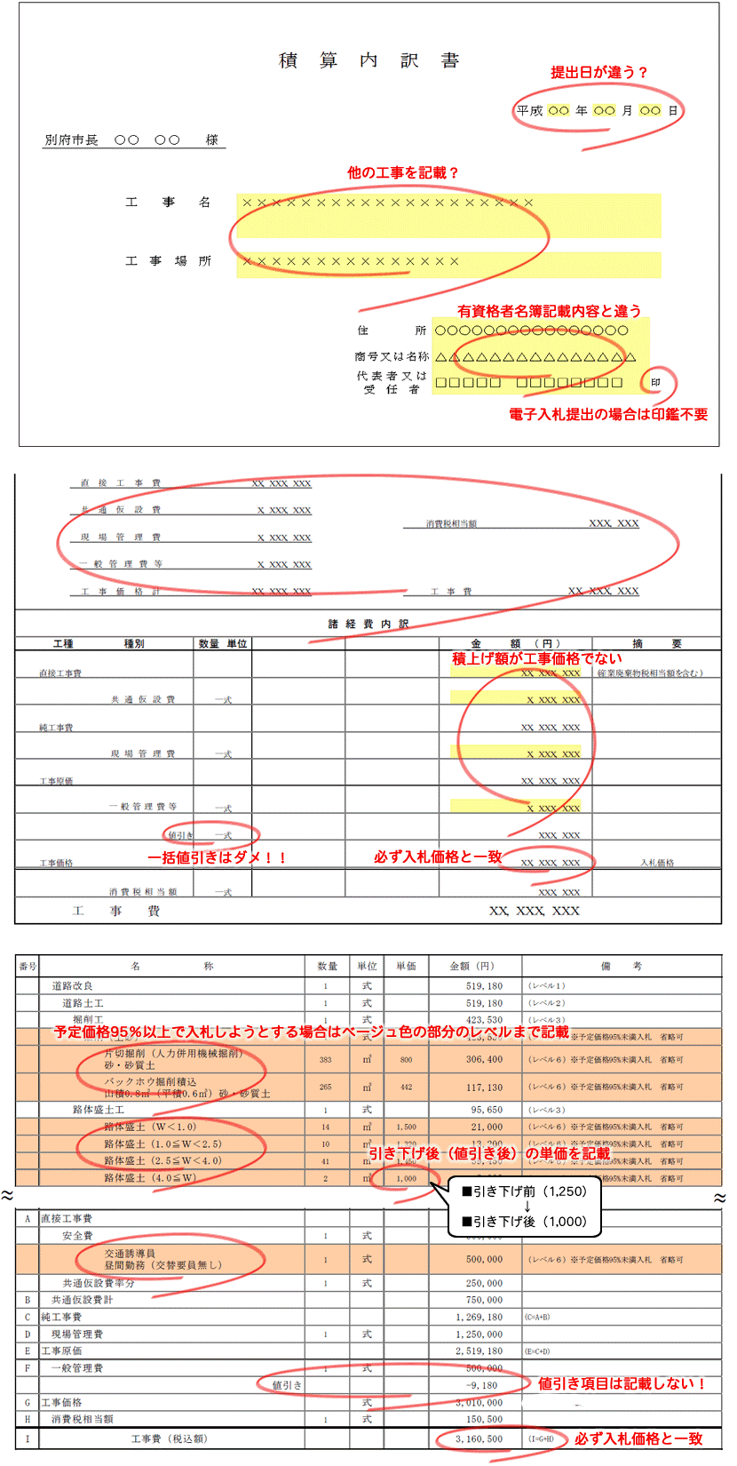 コ.閲覧用設計書(金額抜き)の各項目に対応した内訳が記載されていない場合 サ.項目に漏れ又は誤字脱字等がある場合 シ.一括値引き又は減額の項目が計上されている場合(スクラップ控除等を除く。)※値引きを認めないものではなく、値引きという項目を設けて、一括してマイナス計上することを認めないものである。 ス.積算内訳書の説明を求めた場合において、正当な理由なくこれを拒否した場合 セ.その他積算内訳書に不備がある場合 |