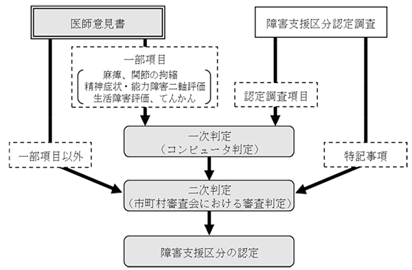 この医師意見書は、区分認定の流れの中で、市町村が一次判定(コンピューター判定)を行う際に、検討対象となるものです。(以下の図「障害支援区分認定の流れ」を参照)