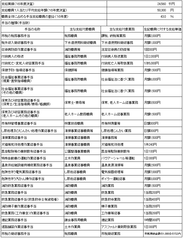 | 手当名 | 内容及び支給単価 | 一般行政職との異同 | 一般行政職異なる内容 | 支給実績 (16年度決算) |